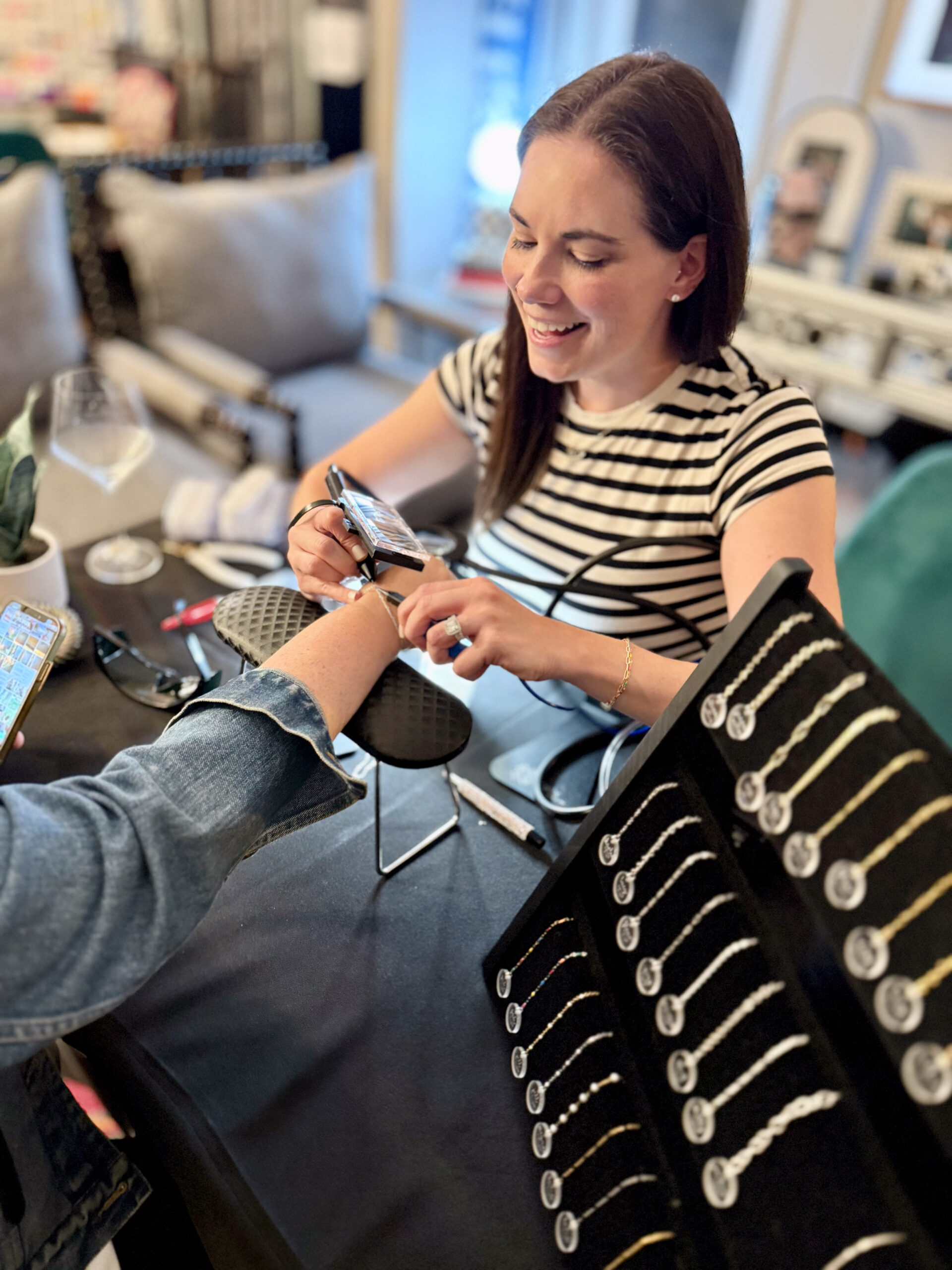 Host a Permanent Jewelry party and make your celebration unforgettable! Whether it’s a bachelorette party, bridal shower, birthday, girls’ night, wedding morning, or private event, I bring the sparkle to you. I make the whole experience easy and stress-free — I’ll set up, style your guests, and help everyone choose their custom chain and charms.