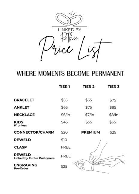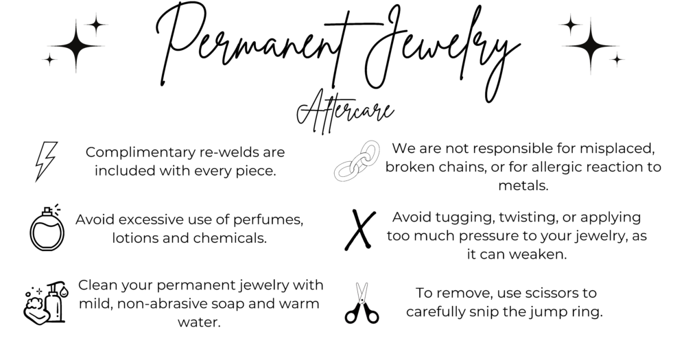 Permanent jewelry is custom-fitted, clasp-free jewelry that’s welded together for a seamless, effortless look you can wear every day. Each piece is tailored to your perfect fit and crafted from high-quality gold-filled, sterling silver, or stainless steel chains.